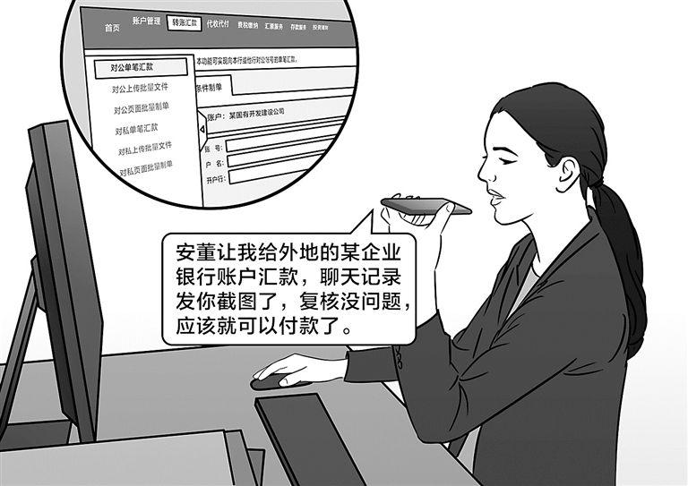 随后,黄某某被拉入一个聊天群,并在该群收到备注名为安某某(该公司董事长)发来的消息,询问黄某某是否接到银行需要年检的通知,并在聊天群中“安排公司相关工作”,这让黄某某轻信了安某某的身份。随即,安某某要求黄某某向外地某企业银行账户汇款。