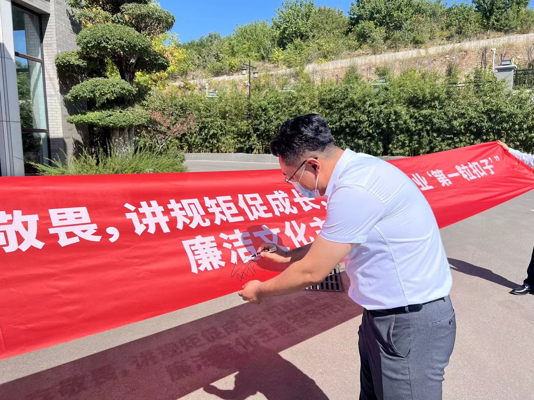 年轻干部在印有“守初心存敬畏,讲规矩促成长,扣好廉洁从业‘第一粒扣子’”的廉洁文化宣传教育月主题横幅上郑重签下自己的名字,表达了筑牢思想道德防线、增强廉洁自律意识的坚定信念。