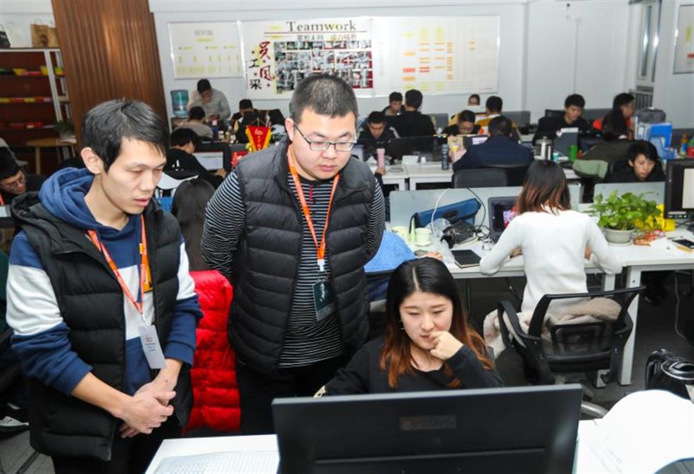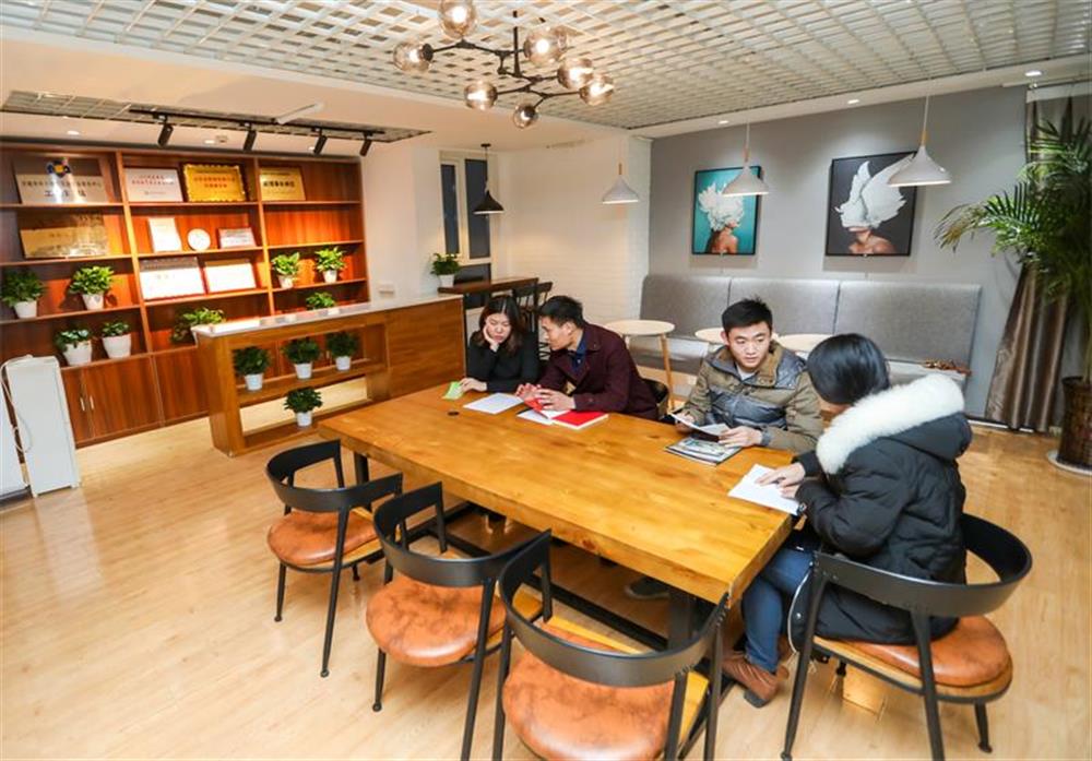 在4楼众创空间,聚集着50多家在孵跨境电商企业,多数都是90后创业人员。25日临近傍晚6点,不少创客仍埋头忙碌。在众创空间打造的咖啡吧,几个年轻人正探讨业务。