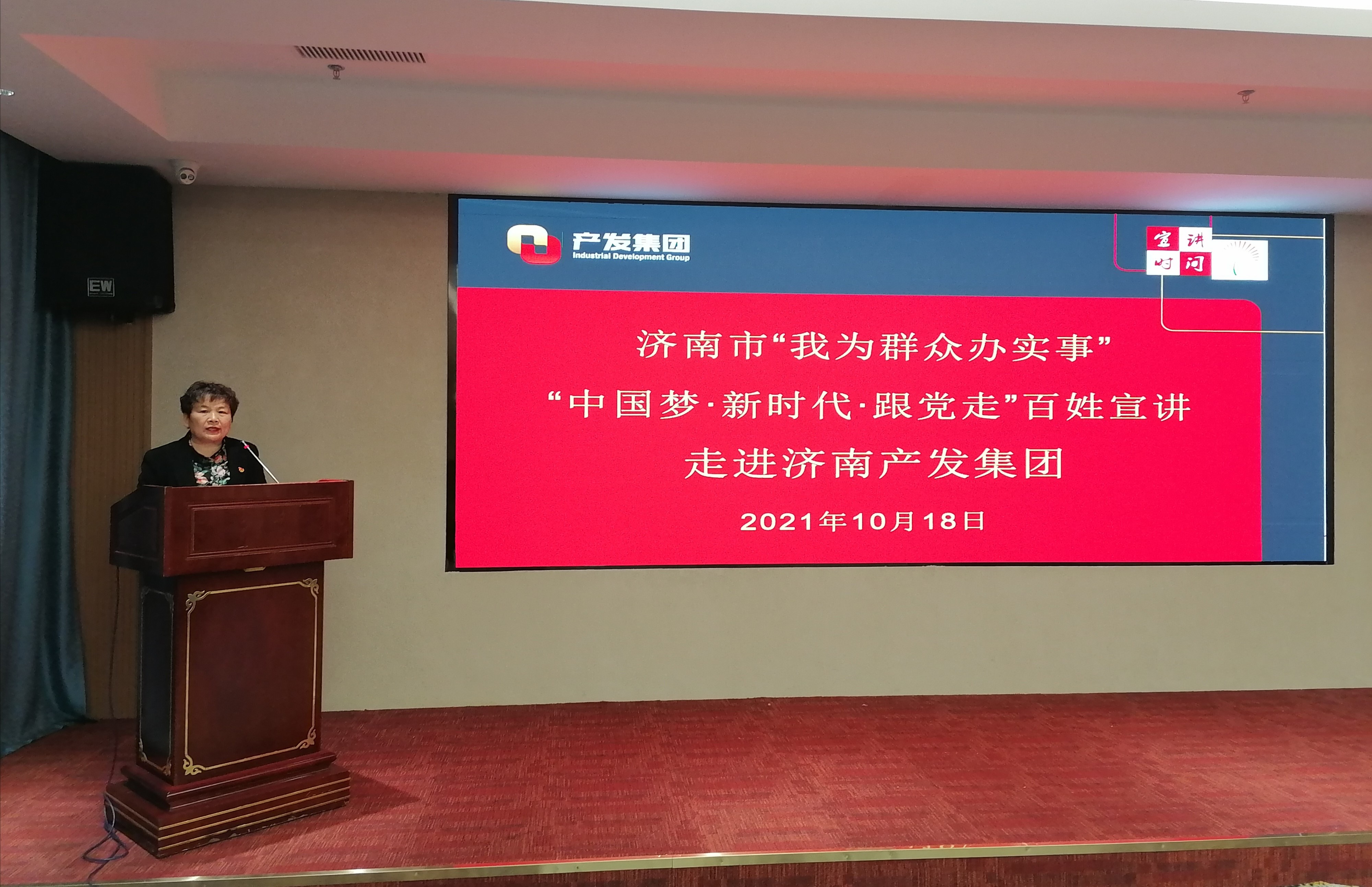 为深入贯彻落实习近平总书记“七一”重要讲话精神,扎实推进党史学习教育“我为群众办实事”活动,10月18日下午,济南市“我为群众办实事”“中国梦·新时代·跟党走”百姓宣讲活动走进济南产发集团。在市委讲师团副处级干部吕桂红的率领下,“我为群众办实事”百姓宣讲团的6位宣讲员用他们的亲历、亲闻、亲为,为产发集团50余名参会干部职工讲述“听党话、跟党走、率先垂范、主动担当、无私奉献”的动人故事。