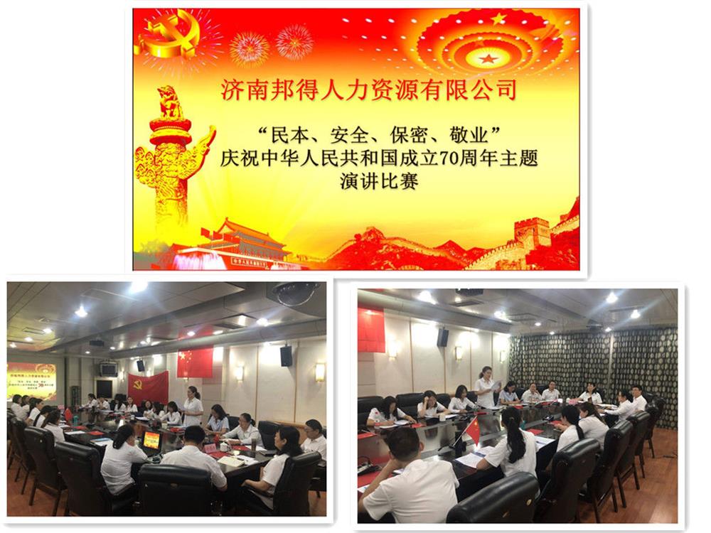 9月29日下午,济南邦得人力资源有限公司“民本、安全、保密、敬业—庆祝中华人民共和国成立70周年”主题演讲比赛活动在济南人才市场六楼会议室热烈举行,邦得公司全体员工牢记公司发展使命,用自己的成长感悟为新中国成立70周年献“礼”。